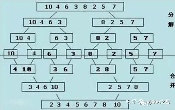 归并排序是采用分治法的一个非常典型的应用,另一个可以采用分治法的是快速排序,归并算法比快速排序速度稍低。归并排序的思想就是先递归分解数组,再合并数组。