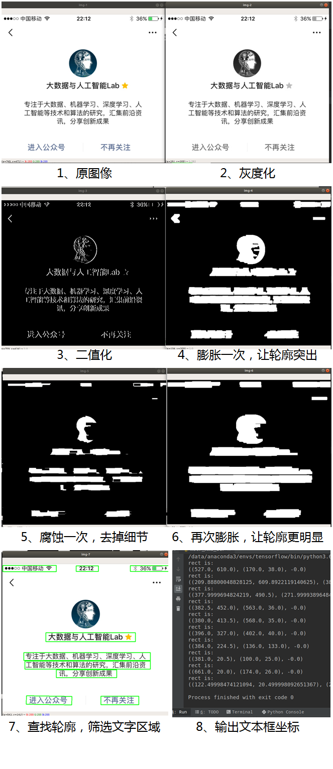 其中,“膨胀”就是对图像中的高亮部分进行扩张,让白色区域变多;“腐蚀”就是图像中的高亮部分被蚕食,让黑色区域变多。通过膨胀、腐蚀的一系列操作,可将文字区域的轮廓突出,并消除掉一些边框线条,再通过查找轮廓的方法计算出文字区域的位置出来。主要的步骤如下: