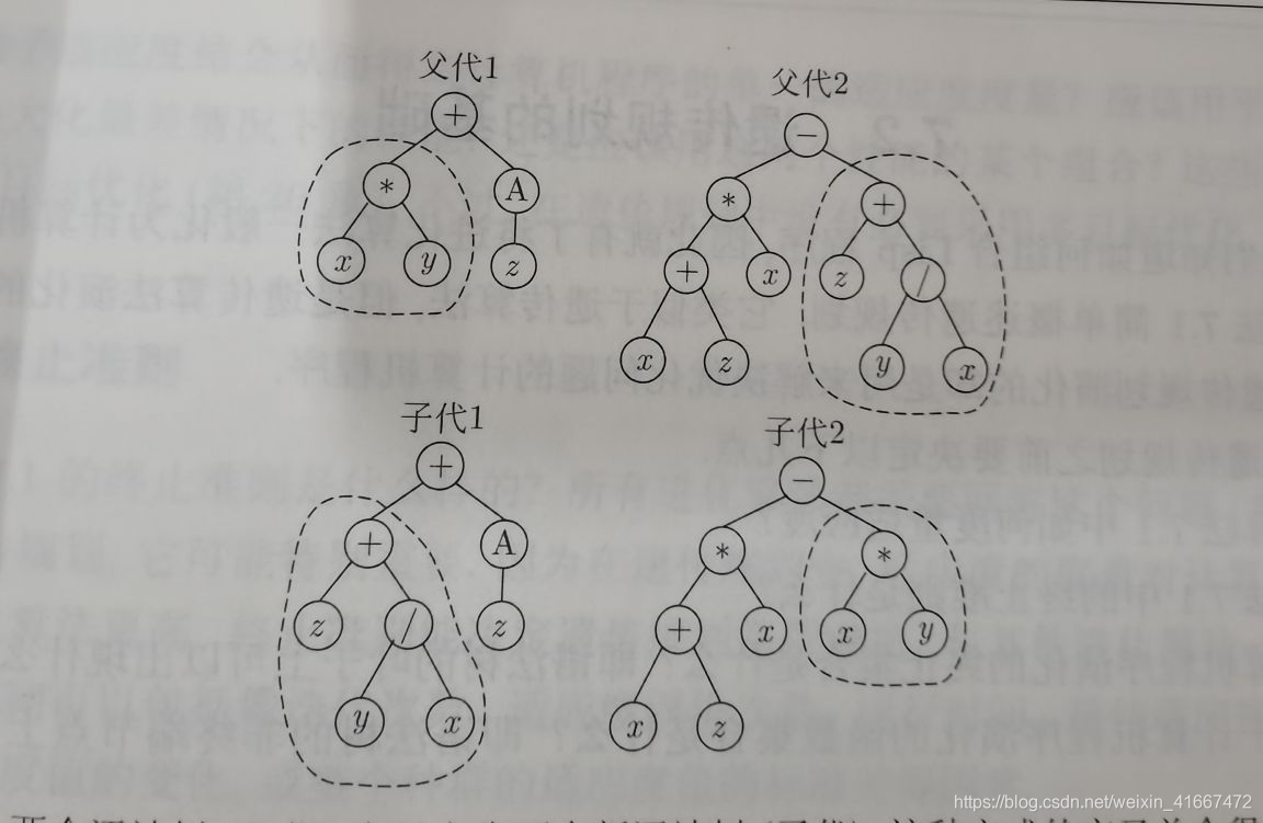 基于树的交叉:随机选择每个父代的一个交叉点并交换在哪些点下面子树,生成两个子代函数。