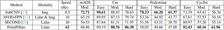 表3:KITTI测试集平均取向相似度(AOS)检测基准结果。SubCNN是性能最好的仅用于图像的方法,而AVOD-FPN、SECOND和PointPillars是唯一预测方向的3D对象检测器。