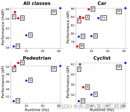 图1:鸟瞰我们提出的PointPillars, PP方法在KITTI[5]测试集中的性能与速度的关系。仅使用激光雷达的方法绘制为蓝色圆圈;激光雷达和视觉方法绘制为红色方块。还绘制了KITTI排行榜的顶级方法:M: MV3D [2], A AVOD [11], C: ContFuse [15], V:VoxelNet [31], F: Frustum PointNet [21], S: SECOND [28], P+ PIXOR++[29]。PointPillars在速度和精度方面都大大优于所有其他仅使用激光雷达的方法。该方法优于除行人外的其他融合方法。在3D指标上也实现了类似的性能(表2)。
