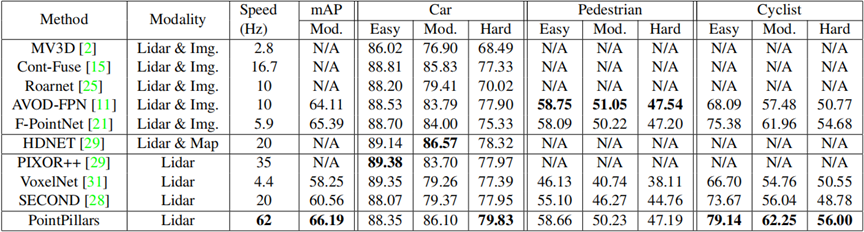 如表1和表2所示,PointPillars在平均平均精度(mAP)方面优于所有已发布的方法。与只用激光雷达的方法相比,PointPillars在所有类别和难度层上都获得了更好的结果,除了简单的汽车层。它在汽车和自行车上的表现也优于基于融合的方法。