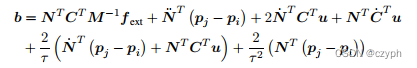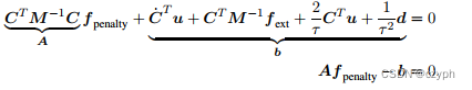 对 d 的求导可以认为是对几个刚体上某个点的速度的加减法(因为无论pi与pj都是刚体上某一点的世界坐标位置)。这里为了方便表达,构造了一个看起来十分复杂的用来描述物体间接触的矩阵。