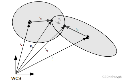 注意:rjk其中jk表示第包含第k对碰撞点的物体的索引值,所谓的rjk实际上是某个j物体质心坐标系的原点。