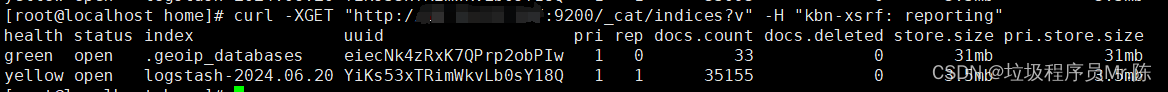 health:索引的健康状态。status:索引的状态。index:索引的名称。uuid:索引的唯一标识符。pri:主分片数量。rep:副本分片数量。docs.count:文档数量。docs.deleted:已删除文档数量。store.size:索引占用的存储空间。pri.store.size:主分片占用的存储空间。