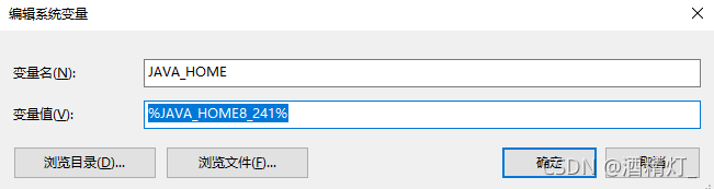 我们再新建一个环境变量,就叫JAVA_HOME,值就设置成%JAVA_HOME8_241%或%JAVA_HOME8%或%JAVA_HOME7%