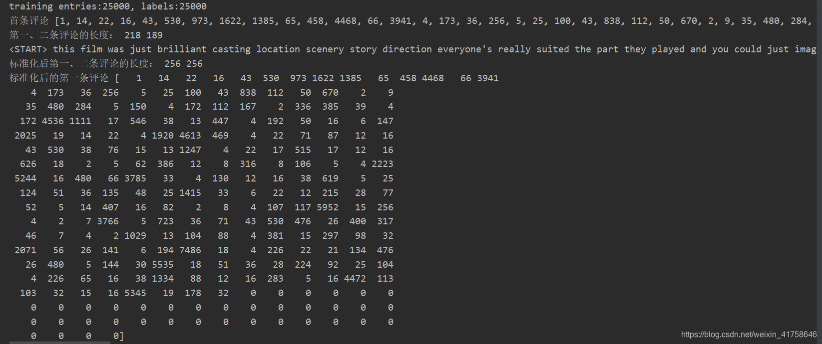 # 使用第二种方法,用pad_sequences函数来使长度标准化,再打印输出看看是否长度相同,也可再检查一下首条评论(原来比第二条评论短一些)