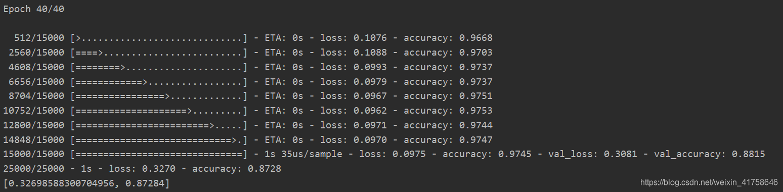 # 以512个样本的mini-batch大小迭代40个epoch来训练模型-指对x_train和y_train张量中所有样本的40次迭代。训练时检测损失值和准确率