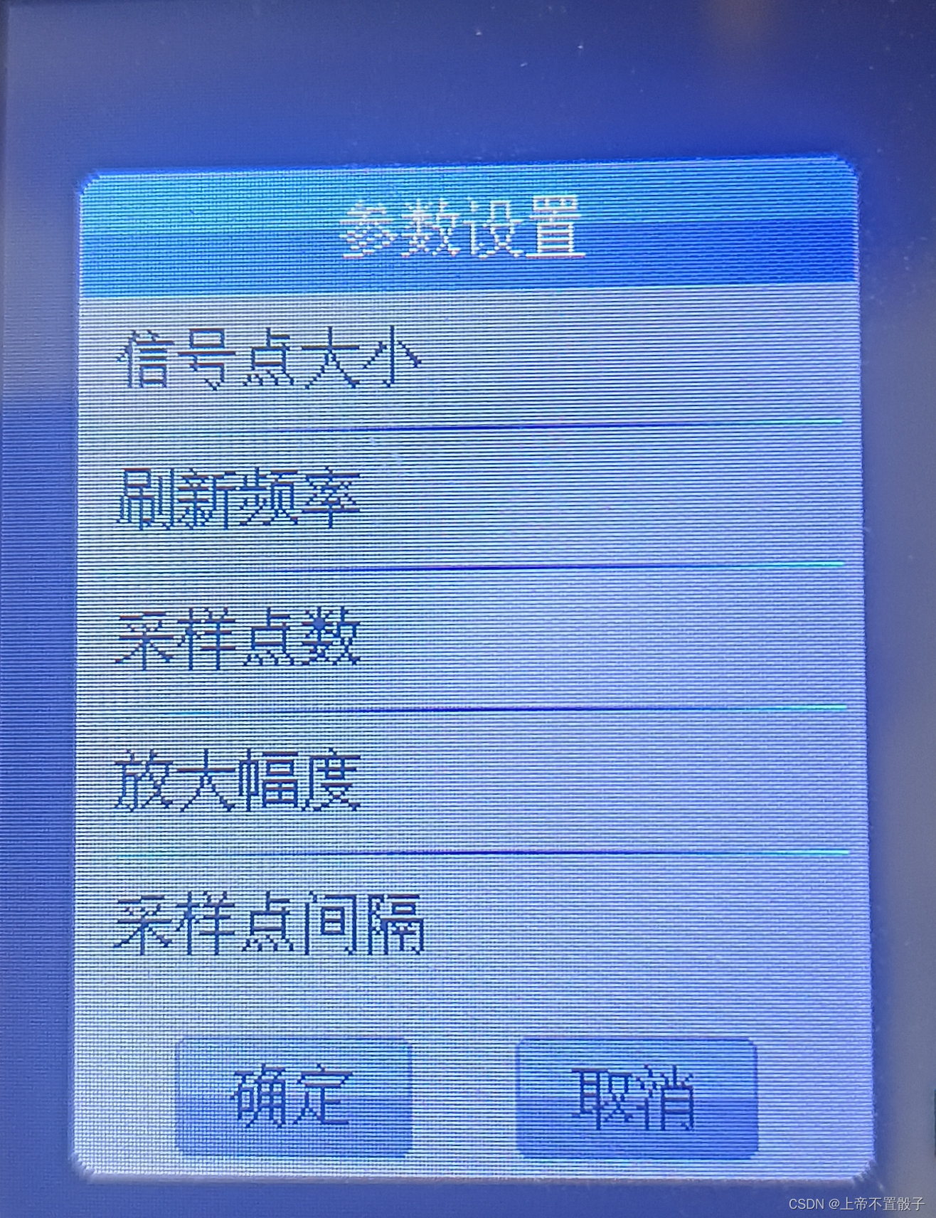 人机交互通过TFTLCD_ILI9488触摸屏实现点击控制示波器的信号点显示大小,采样频率,信号放大幅度,采样点间隔及单次采样的信号点个数。点击屏幕会出现相关设置的选择界面,点击对应按键即可实现示波器相关参数的修改。