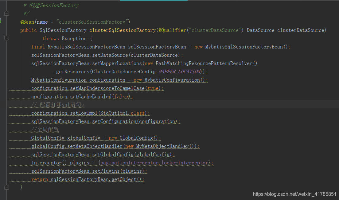 在配置文件中加入:MybatisConfiguration configuration = new MybatisConfiguration();configuration.setMapUnderscoreToCamelCase(true);configuration.setCacheEnabled(false);// 配置打印sql语句sconfiguration.setLogImpl(StdOutImpl.class);sqlSessionFactoryBean.setConfigura