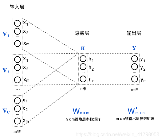 这是一个具有一个隐藏层的全连接神经网络,输入层是上下文窗口内各个词的M维one-hot向量(给每个词编个号,向量中对应维度取值为1,其他维度维0)的线性叠加,输出层是一个m维向量Y。其中m为词的数量,n为设定的欲训练的词向量的维度。隐藏层和输出层的计算公式如下(矩阵表示):