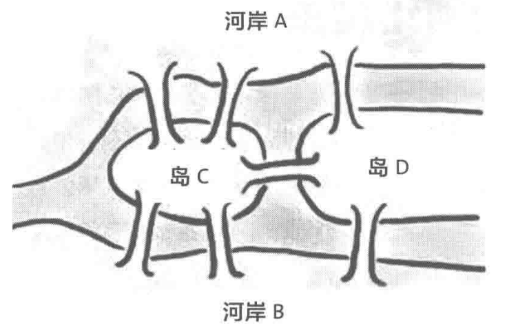 注:欧拉基于“哥尼斯堡七桥”问题,提出了一个定理——“如果一个图能够从一个顶点出发,每条边 不重复地遍历一遍回到这个顶点,那么每一顶点的度(即与顶点直接相连的边的数量)必领为偶数”。显然,下图中“河岸A”与“河岸B”的度明显是奇数,因此“哥尼斯堡七桥”问题是无解的。