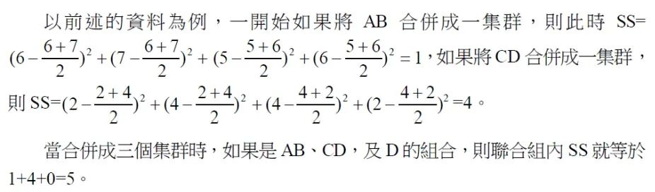 当两个点被聚为一类时,这一类的组间差异 SS 便为其中一点的某一坐标与另外的所有坐标加加减减的一系列操作(通俗解释,其实直接看上图的 SS 计算过程已经可以理解。)