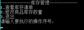 上述方法用来完成库存管理功能菜单的显示、接收管理员选择的功能操作序号。这是完成了案例的第一步。接下来完成“查看、修改、退出”这三项功能。