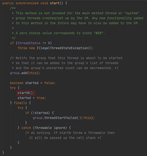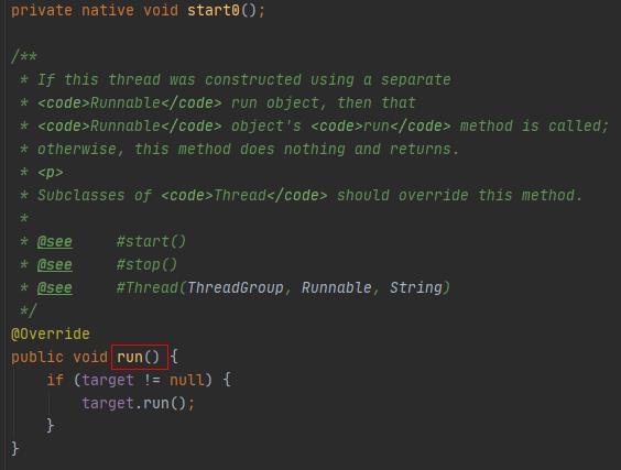打开start()原码,会发现start()会调用本地方法start0(),再本地方法start0()中会调用run()方法。