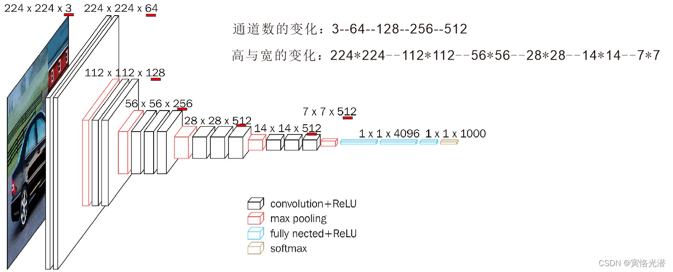 可以看出 每次的输出的高和宽减半,通道数翻倍,当高宽变成7*7之后传入到全连接层,由于都是3*3的卷积核,所以每层模型的参数尺寸和计算复杂度与输入高、宽、通道数以及输出通道数的乘积成正比。VGG的这种高宽减半以及通道数翻倍的设计,使得多数卷积层都有相同的模型参数尺寸和计算复杂度。
