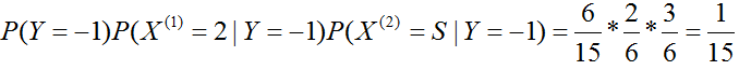 试由下表的训练数据学习一个朴素贝叶斯分类器并确定x=(2,S)T的类标记y。表中X(1)和X(2)为特征,取值的集合分别为A1={1,2,3},A2={S,M,L},Y为类标记,Y属于C={1,-1}。