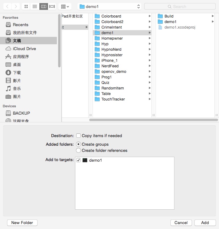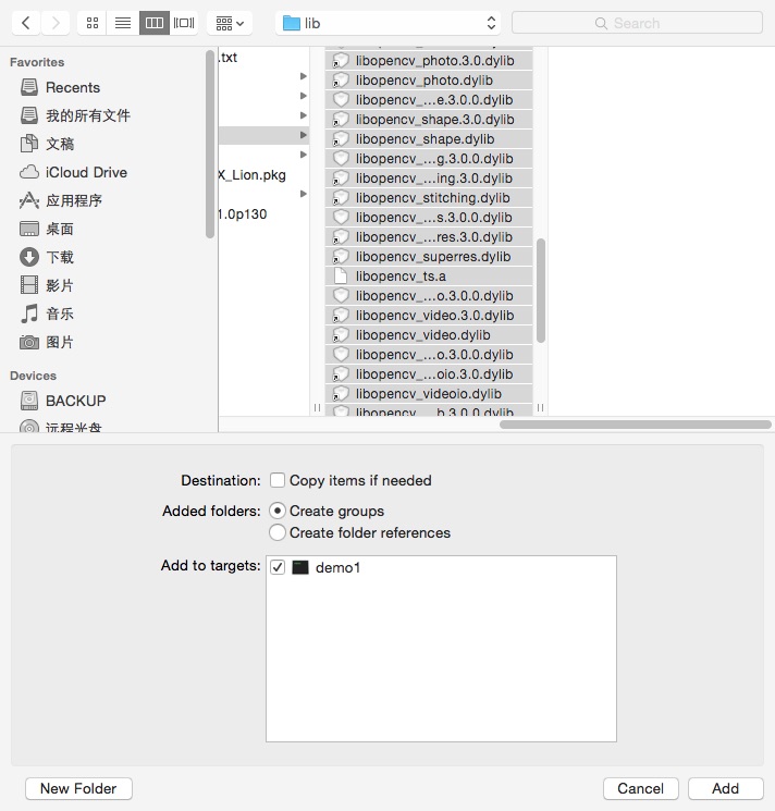 7、选中所有文件名包含libopencv的文件,不选copy items if needed,单击Add。