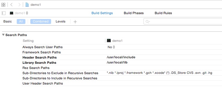 8、选中工程,修改Build Settings中的Paths,将Header Search User Paths改为“/usr/lcoal/include”,将Library Search Paths改为"/usr/local/lib".