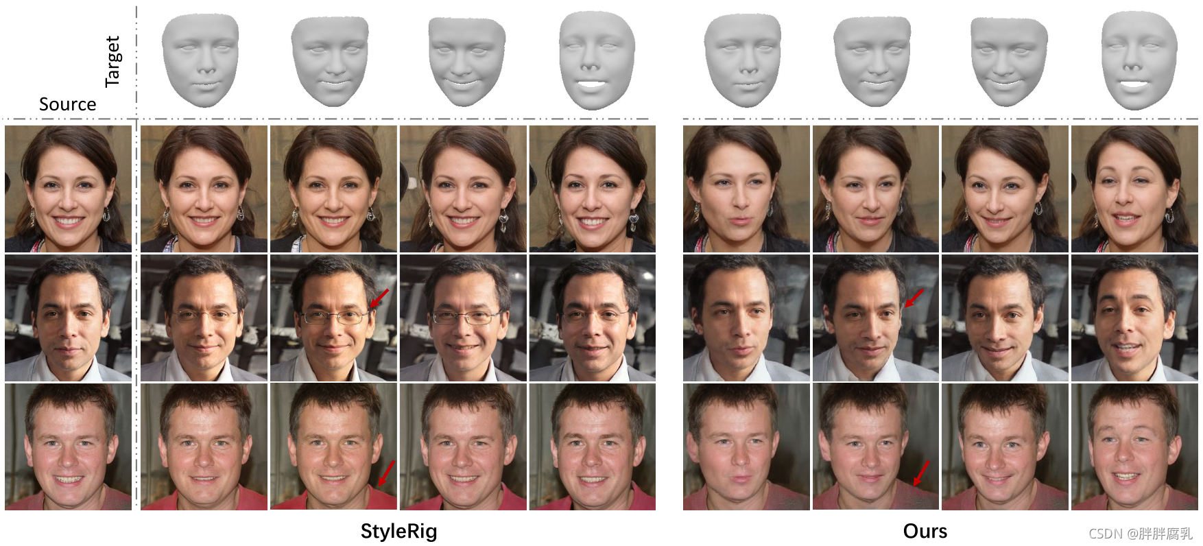 最近,生成性对抗网络(GANs)[14]的进展在合成真实人脸方面取得了巨大进展[5,22,9]。由GANs驱动的一些方法[3,42]通过图像翻译技术解决这一任务,其目标是训练模型,使给定输入指令(如边缘)的生成图像的条件分布类似于真实图像的条件分布。一些后续算法通过提出有效的变形模块[45,49,30,8,28,31]或向目标[41,6]注入源神经纹理来实现更好的通用化。然而,绝大多数现有方法使用间接的和特定于主题的运动描述符,如边缘[42,41,28],语义分割[8],或者关键点描述目标的运动。尽管这些具有2D空间信息的描述符有利于目标图像的生成,但它们阻碍了模型以直观方式编辑肖像的能力。