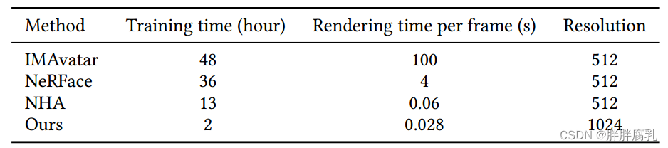 表5:各方法的训练时间、渲染时间和图像分辨率。与现有方法相比,我们的方法在训练中明显更快,并且能够以更高的分辨率实时渲染图像。
