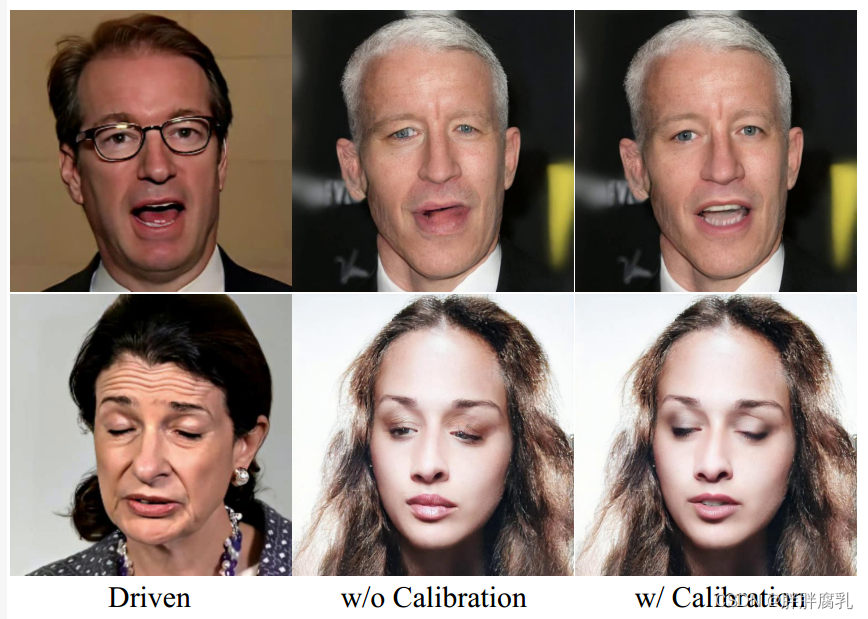 校正网络。直接将流场应用于特征图将导致眼睛和嘴巴周围出现明显的伪影,例如,对于闭合的嘴巴,2D翘曲无法生成牙齿。因此,我们设计了校正网络来校正特征空间中由翘曲引起的伪影。我们比较了有和没有校准网络的性能。结果如图14所示。可以看出,不使用标定网络,模型不能正确生成牙齿和闭眼。该矫正网络极大地改善了眼口周围的形状和内容。
