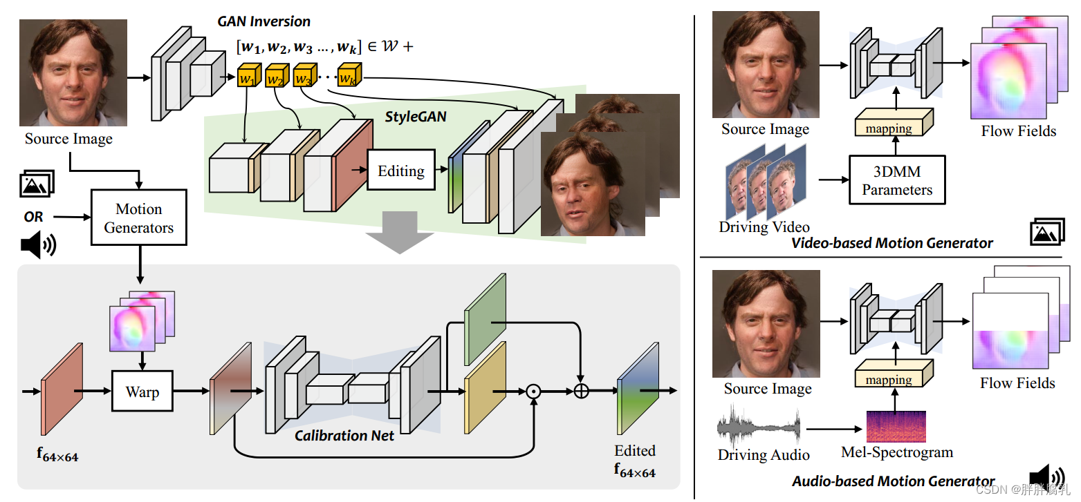 受我们在第3节中观察到的启发,我们提出了一个基于预训练StyleGAN的F空间挖掘的统一框架。如图4所示,我们的方法包含实现这一目标的几个步骤。给定单源图像,我们首先使用GAN反演方法[55]获得源图像的潜在样式代码和特征映射。然后,为了注入精确的运动引导,我们直接从视频(4.1节)或音频(4.2节)中通过运动生成器预测密集流场。最后,由于翘曲操作可能会由于遮挡和错误映射而引入伪影,因此引入校准网络来更新编辑过的空间特征图(第4.3节)。下面,我们将详细讨论每个部分。
