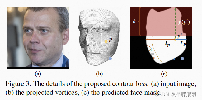 我们提出了一种新颖的轮廓感知损失 L_con 来实现面部轮廓的精确建模。 L_con 作用在中频几何M1 (figure 2)上,旨在拉动边缘的顶点以对齐面部轮廓。 如上图所示,我们首先将 M1 的顶点投影到图像空间中。 然后我们使用预训练的面部抠图网络 [6] 预测面部掩码M_face 并进行后处理以获得每一行的左侧和右侧点。 给定顶点 p 和 M_face 上对应的投影点 p’,我们得到向量 l_p 和 r_p(从 p’ 到水平方向的边缘点)。 那么L_con可以描述为: