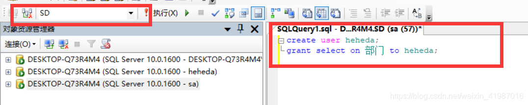 10.创建好用户之后把sa的select权限授权给heheda用户。执行sql语句: