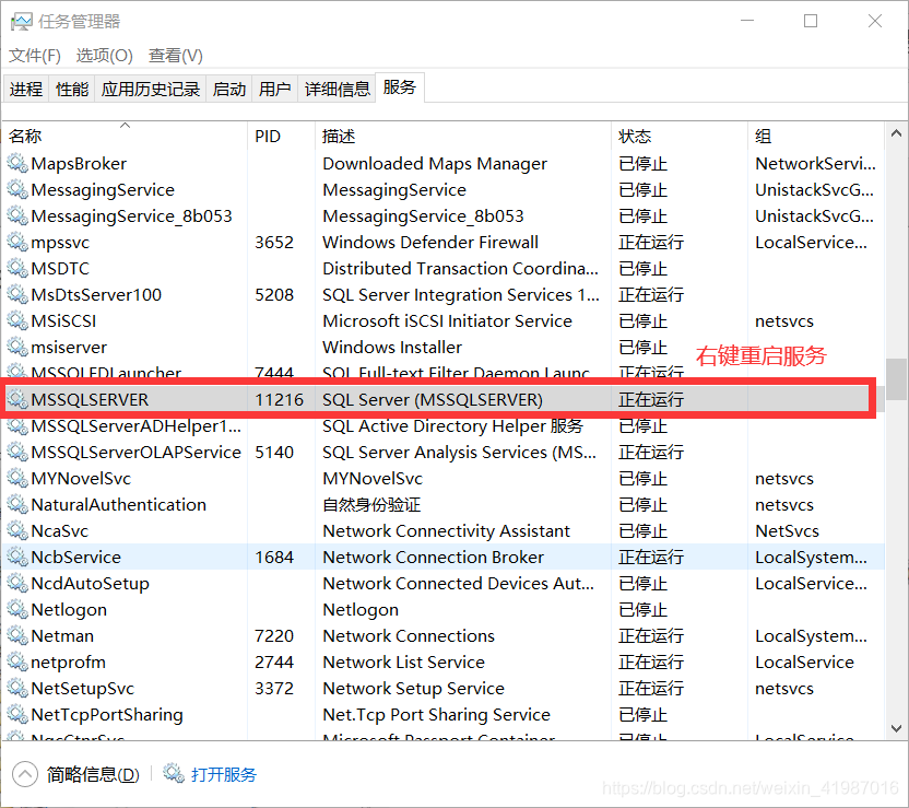 ②打开任务管理器,shift+ctrl+ESC,找到服务MSSQLSERVER,在修改服务器身份验证后,需要重启服务