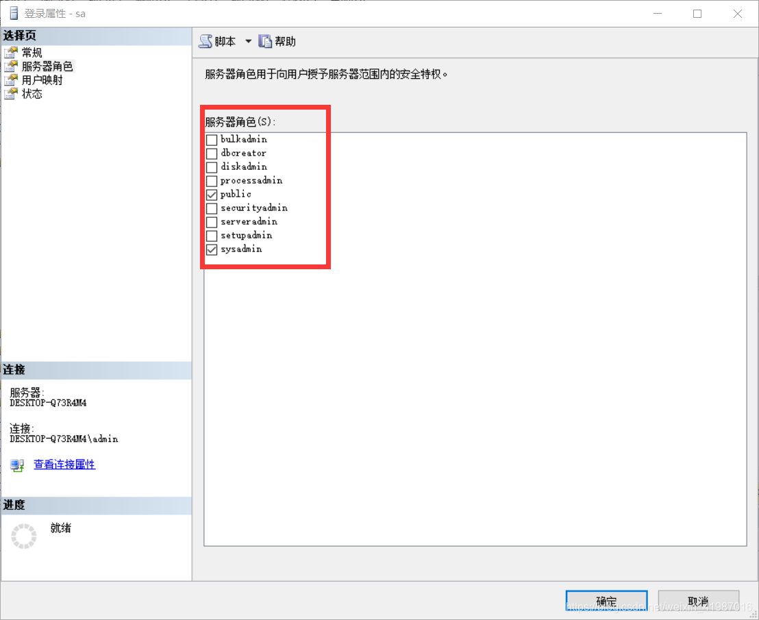 登陆属性-sa”中-->点击“服务器角色”, 为添加该用户要实现哪些角色。一般我们自己使用都是配置最高权限的角色,一个是public ,还有一个是sysadmin。按照下图操作即可