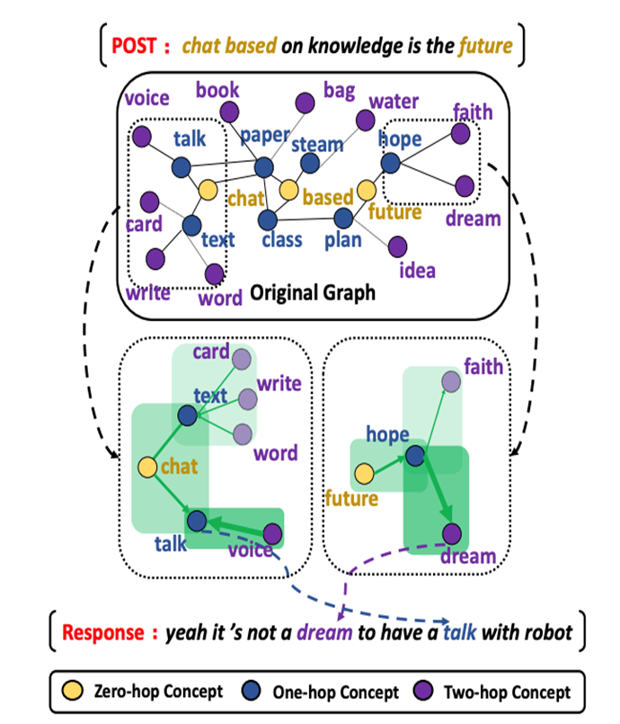 这篇同样用到了知识图谱作为先验的知识,这里的知识图谱是用的通用知识图谱ConceptNet,对话数据用的是Reddit。