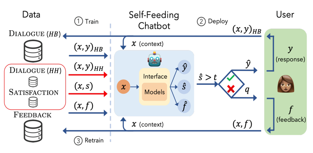 模型进行多轮对话,具体为输出一个y^和用户的满意度s^,如果s^大于一个门限 t,那么就继续对话,并且收集到一个对话DIALOGUE 数据集 (x,y)HB,相反给出一个f(我应该回复什么呢?),根据用户的反馈f,得到另外一个训练集FEEDBACK (x, f)。
