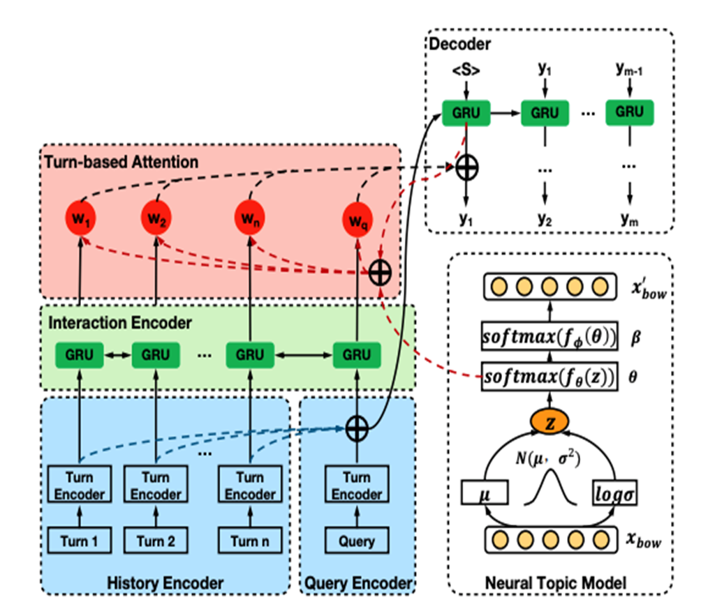 这篇paper解决的是在谈话中,通过隐式解决主题应用,核心思想也是将主题通过一个高斯分布(μ,σ)映射成一个隐式主题向量θ, 然后将其联合建模decoder。