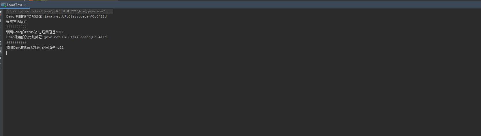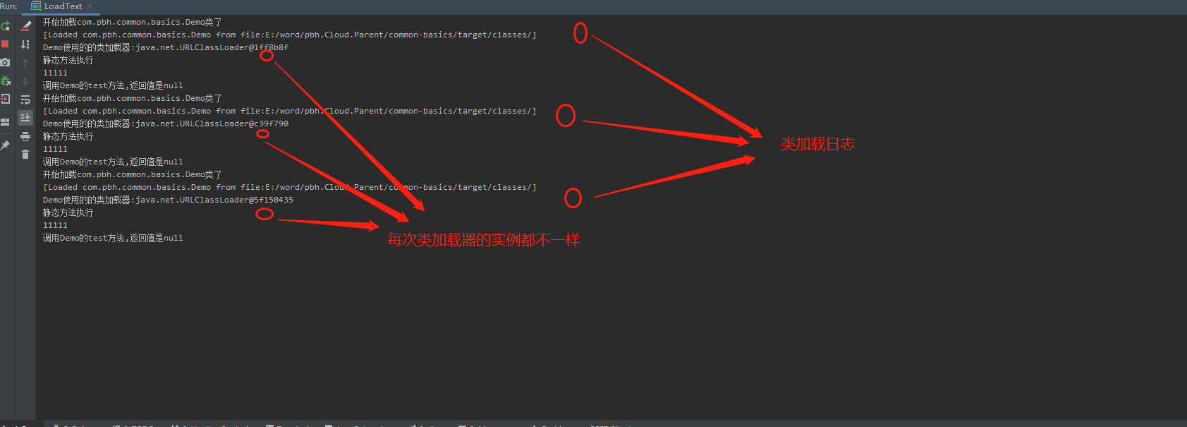 可以看到,Demo类每次循环都被重新加载了,因为每次加载他的加载器都是不同的实例,如果是同一个类加载器实例加载同一个类,那么这个类就不会被重新加载.这也是很多框架实现的热加载功能