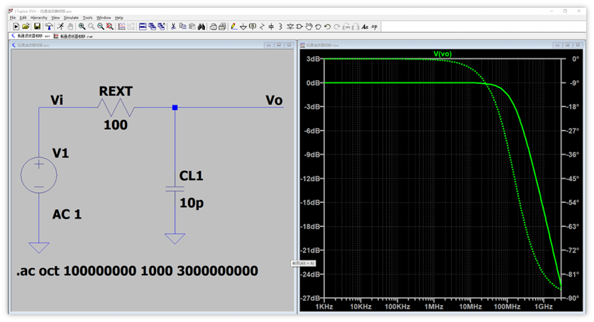 Rext和匹配电容CL1构成一个低通滤波器,带来的相移是小于90°的,这应该很容易知道,下图是Rext=100Ω,CL1=10p的低通滤波器的幅频曲线,可以看到,输入与输出的相位差是:0°~90°,输出滞后输入。