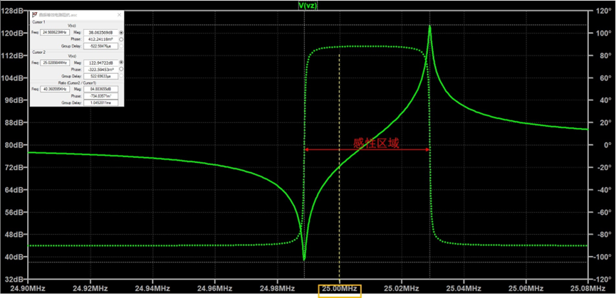 从图中可以看出,两个尖之间的区域,相角大于0,就是呈感性的区域,晶体振荡频率25Mhz正好处于这一区域。