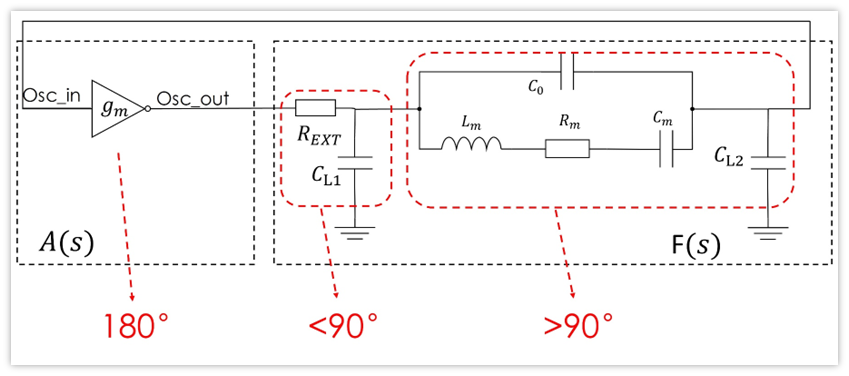 Rext和匹配电容CL1带来的相移是小于90°,那么晶振与CL2带来的相移必须大于90°,如此才能凑够180°。