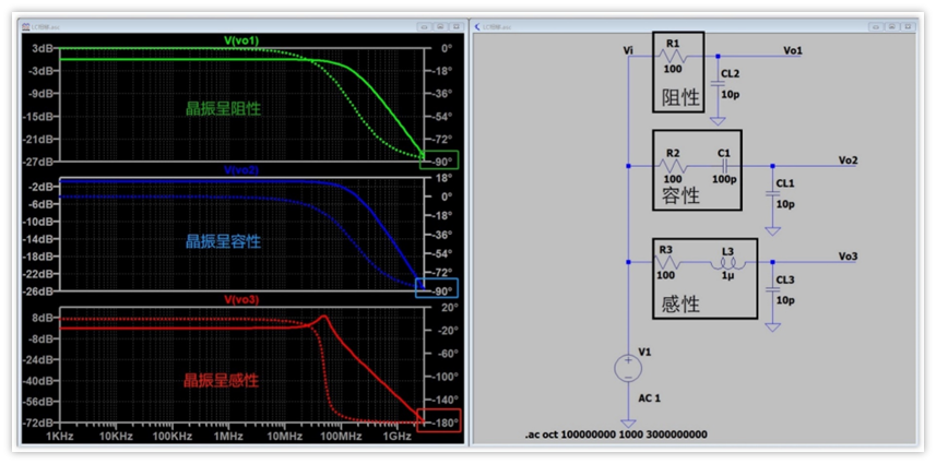 晶振等效电路有三种元器件构成,电阻,电感,电容,其总的等效阻抗可能有三种情况:呈阻性,呈容性,呈感性。