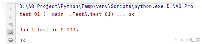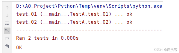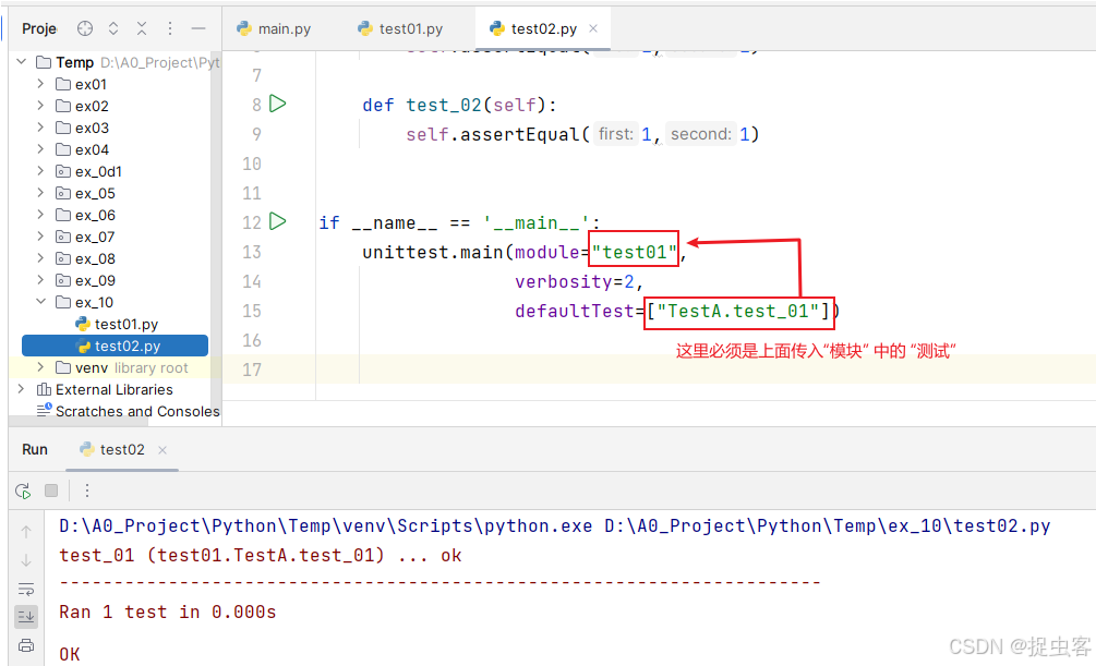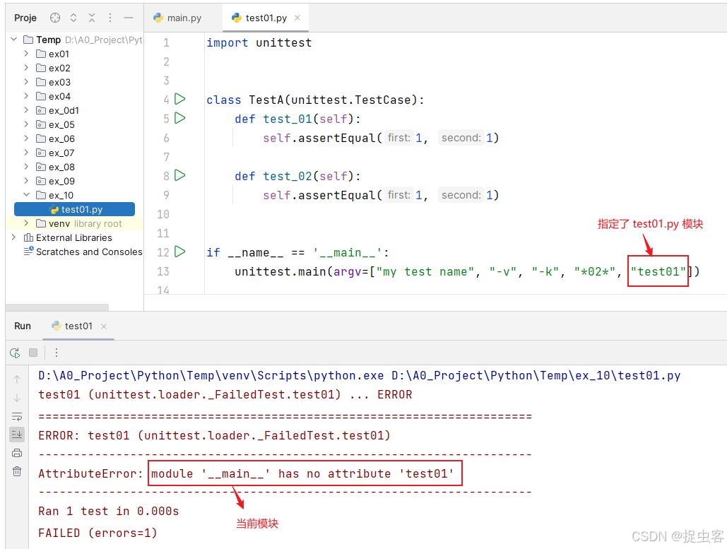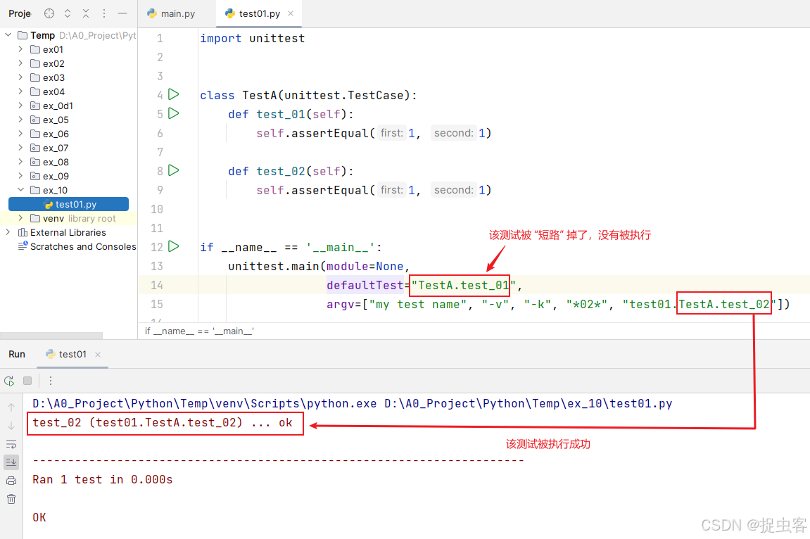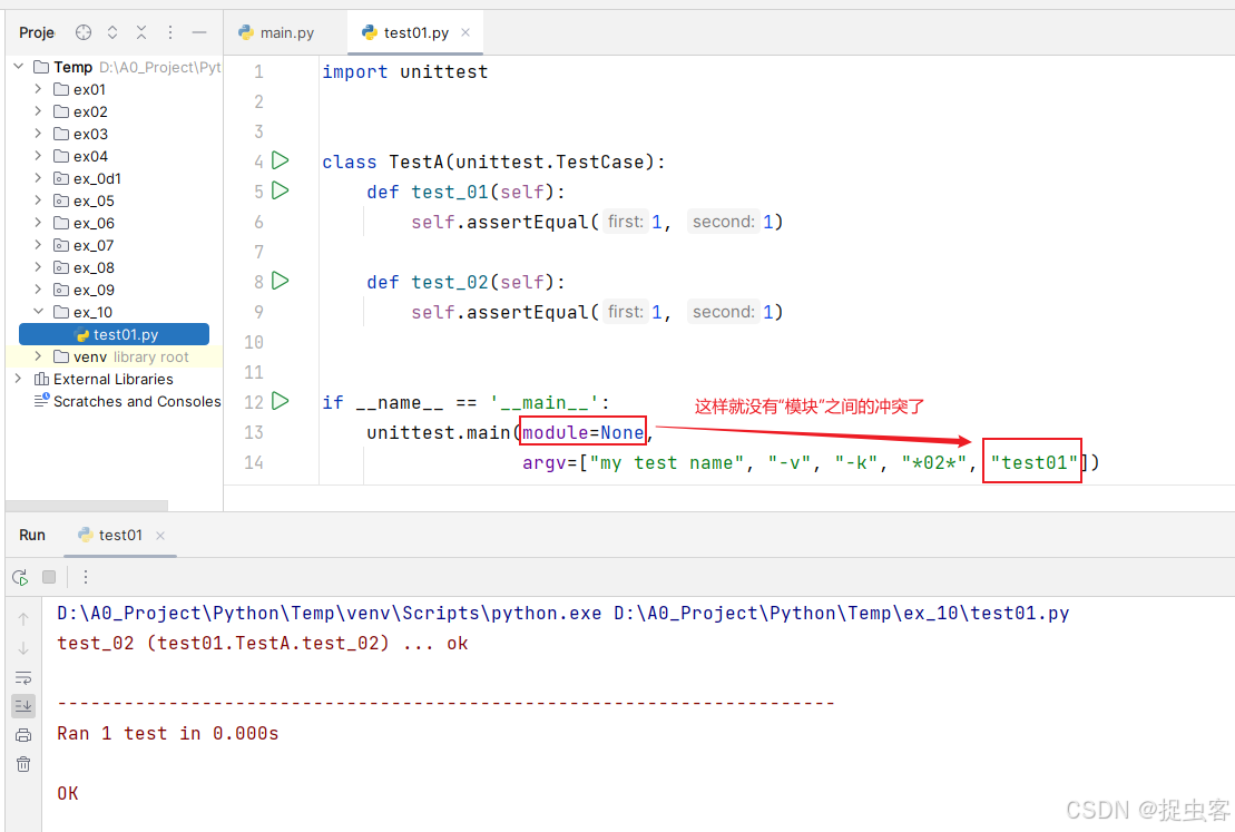 - argv 参数中模拟命令行的 tests 参数为 “test01”(即 test01.py 模块名称)