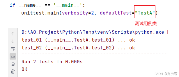 - testLoader: (unittest.loader.TestLoader, 默认值:loader.defaultTestLoader):负责发现并加载测试的 TestLoader 类实例。默认情况下,使用unittest模块提供的标准测试加载器,它可以找到并组织模块中的测试类和测试方法。