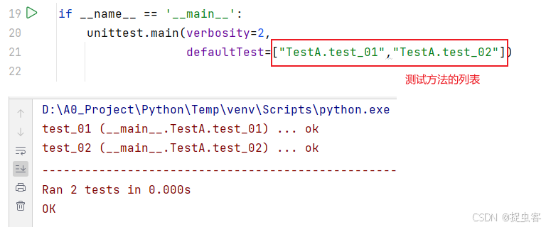 - defaultTest: (str, 默认值:None):如果指定了这个参数,unittest将只运行与这个参数匹配的测试集合。可以是一个类名或者方法名或者其列表,支持点号.连接来指定嵌套关系。
