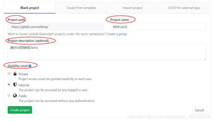 在GitLab网站点击导航条上的 “+” 即可进入创建项目的页面,然后根据提示填写相应信息,如下图: