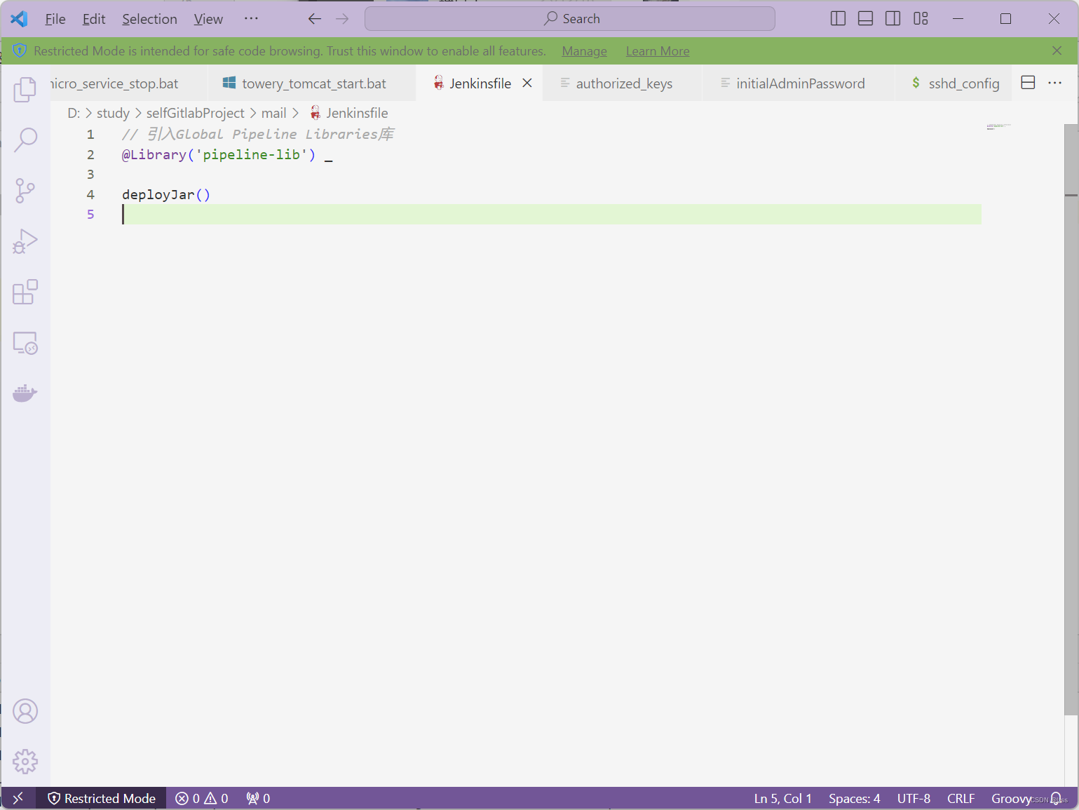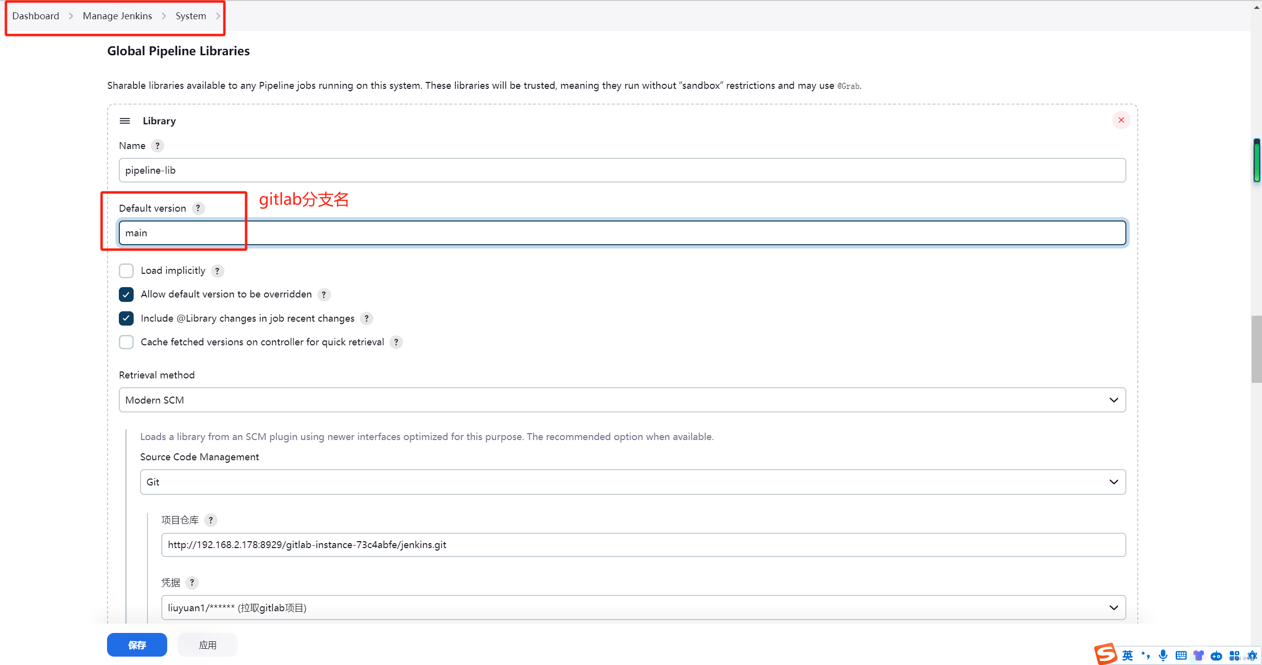 配置Global Pipeline Libraries库,供所有部署的项目使用一套脚本即可。gitlab创建一个项目存放脚本文件