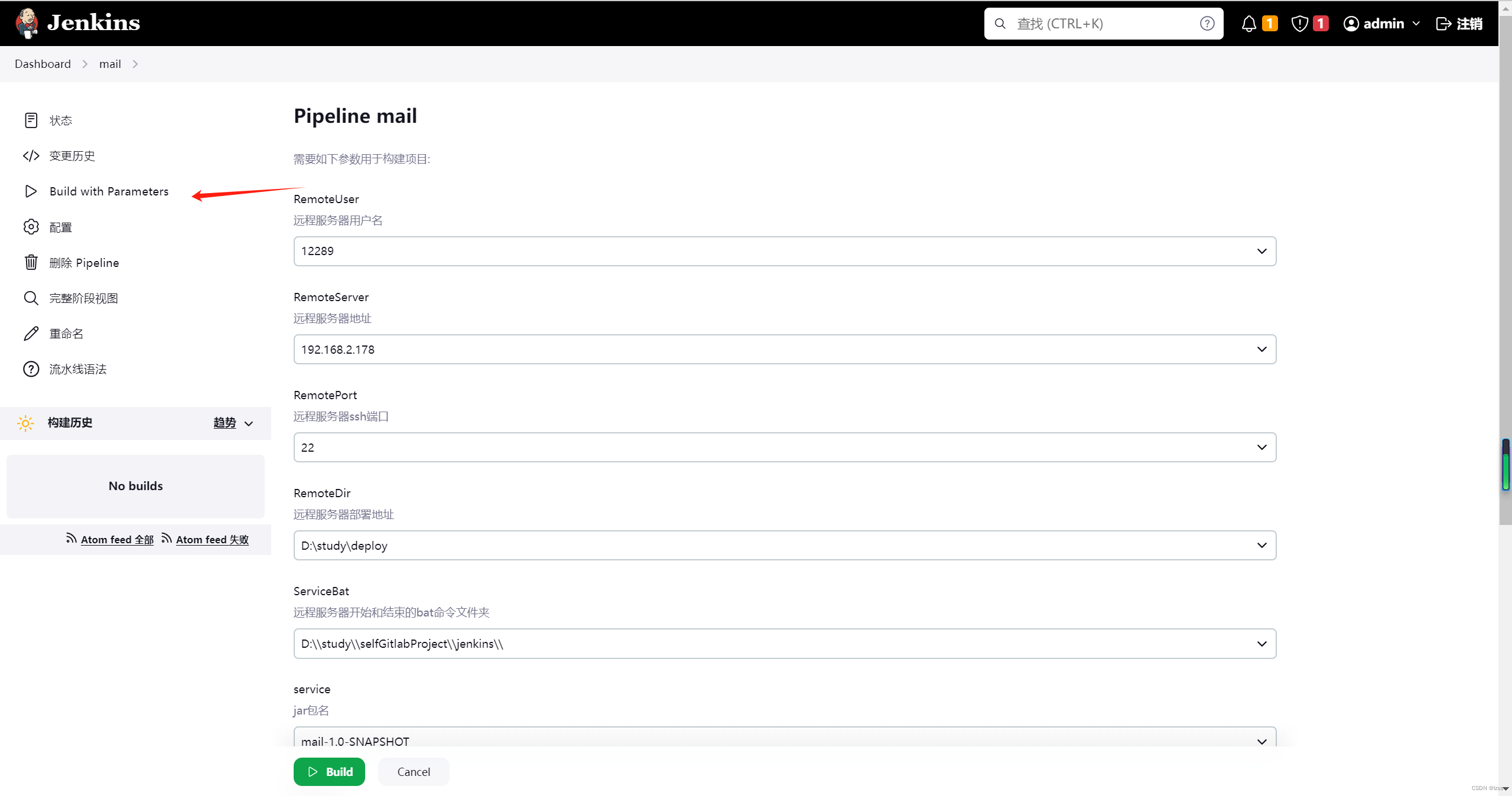 点击这个build with paramerters,看一下参数,没问题点击build进行部署