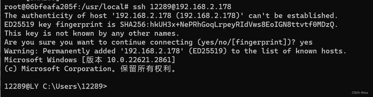 再次进入到jenkins容器里,使用ssh 12289@192.168.2.178连接远程服务器,第一次输入yes,有的会让你输入该用户的密码,第二次可直接进入