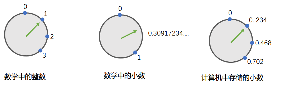 ↑ 计算机中存储的小数是一个一个的, 绿色指针必须一次走一格, 就像整数那样
