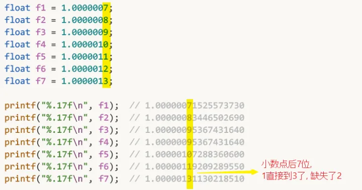 所以32位浮点数的精度最多是7位十进制(0 - 9 999 999), 共10 000 000种状态