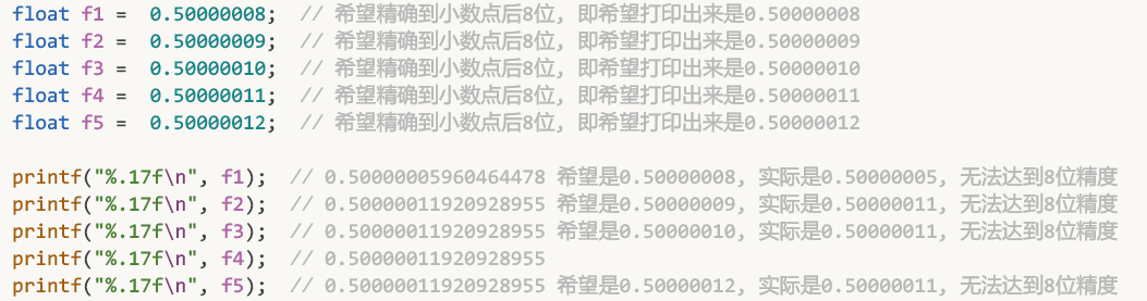 如果32位浮点数的精度是8位十进制的话(0 - 99 999 999), 这一共是100 000 000种状态, 大于了32位浮点数能存储的状态上限16 777 216...所以说精度到不了8位十进制数.