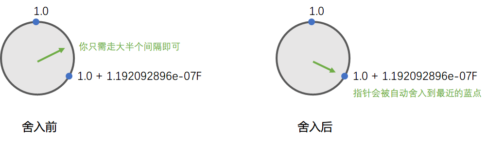 等等, 这里好像忽略掉了舍入规则: 1 ~ 2范围中, 两个蓝点之间的间隔是: 1.19209e-7, 但这并不意味着想从当前蓝点走到下一个蓝点需要走满一个间隔啊, 因为有舍入规则的存在, 其实你只要走大半个间隔就行了, 然后舍入规则会自动把你舍入到下一个蓝点...